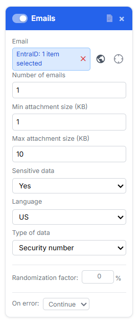 Multi-locale DLP validation: Stack three Emails cards each with a different language (FR NIR, DE Rentenversicherungsnummer, UK NI number) against the same mailbox. Confirms that all your locale-specific DLP policies fire correctly in one run.