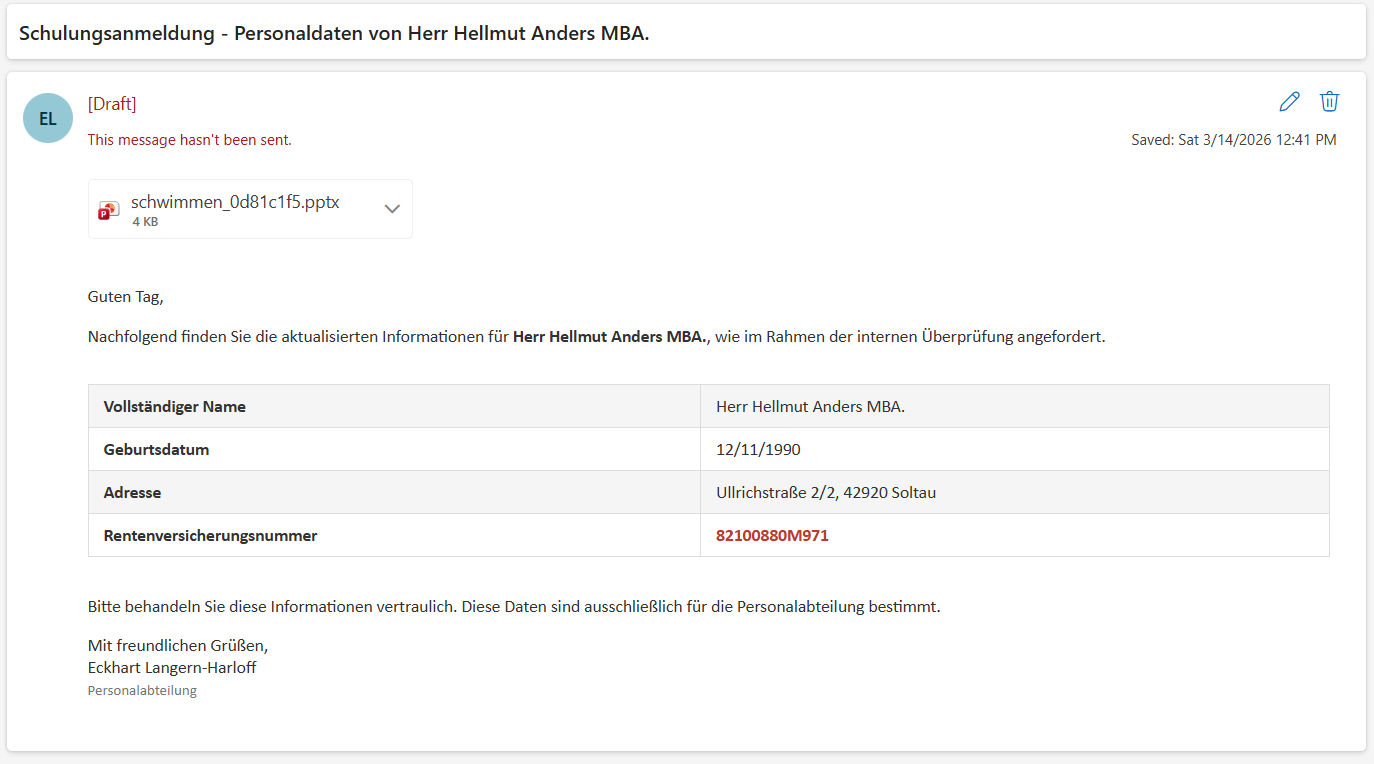 Localizaed name and address, a perfectly formatted US Social Security Number, and to top it off, it's coming straight from HR. Purview doesn't stand a chance of missing that one!