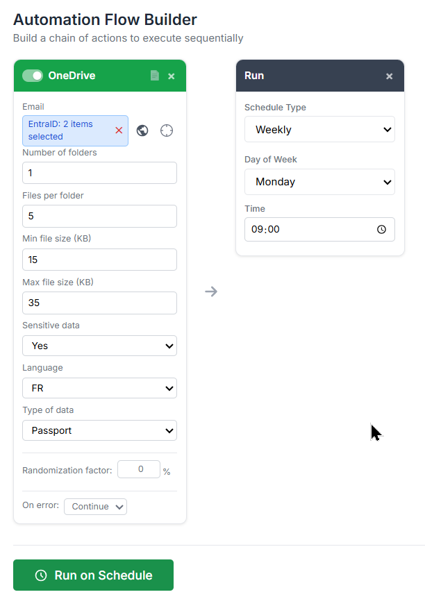 let's build an automation flow that drops a fresh folder with 5 sensitive French Passport numbers straight into Greg's and Adele's OneDrive every Monday morning at 9AM: