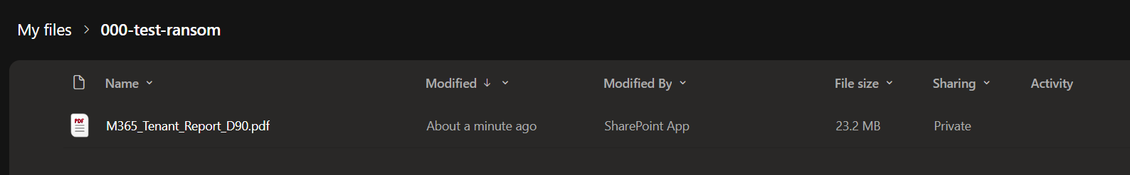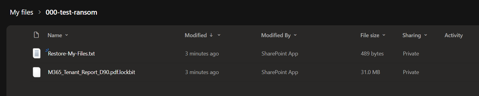 - It triggers data exfiltration pattern by pushing a massive amount of files out to an external server (the m365simulator server in order to encrypt the files), then following up with the encrypted versions.