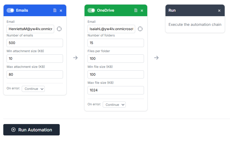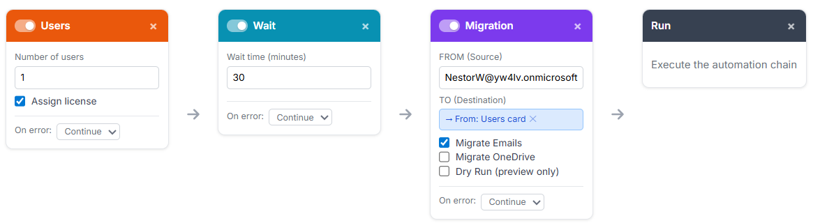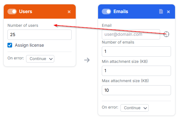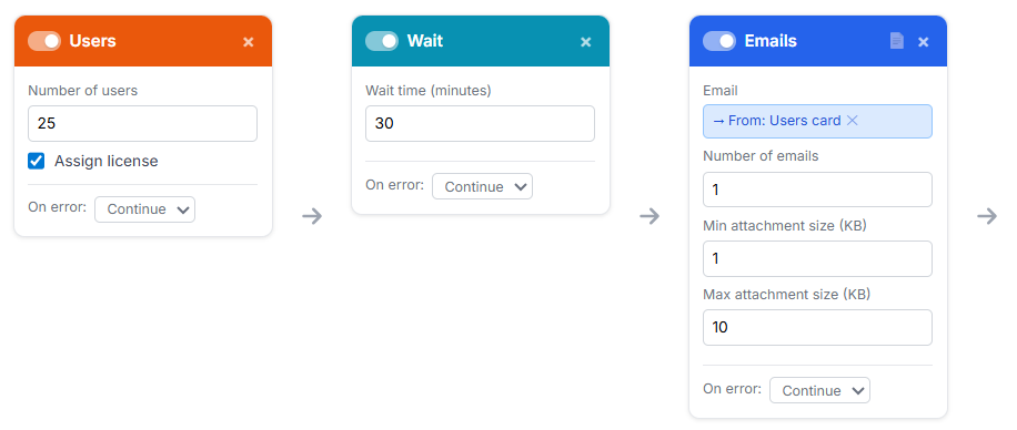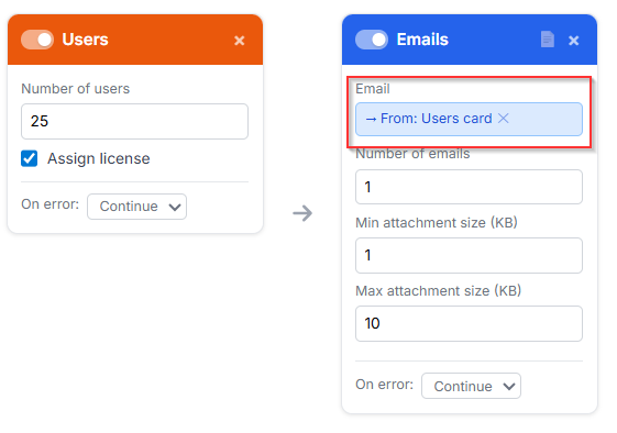 That’s where orchestration shines, by chaining cards in sequence and letting the tool pass context between them. Once the users are created, their details can be used as dynamic input for the next card, like injecting emails into their inboxes automatically.