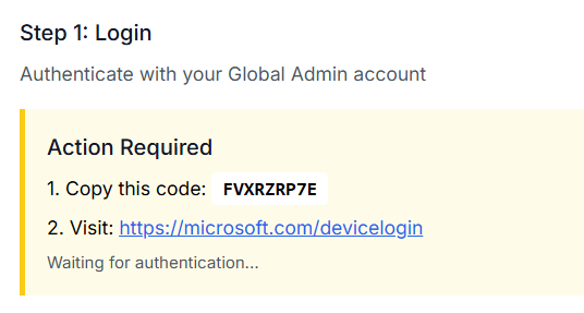 Login via device code flow using your Microsoft 365 Global Admin account.