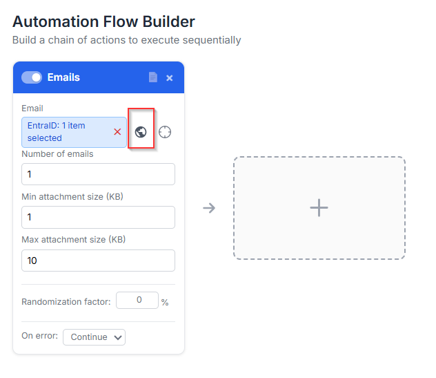 In the automation flow, you can stack multiple cards to streamline your process. Each card needs an input, for example, an Email card requires a target user account to create the emails.