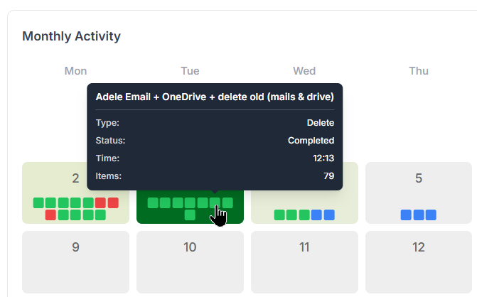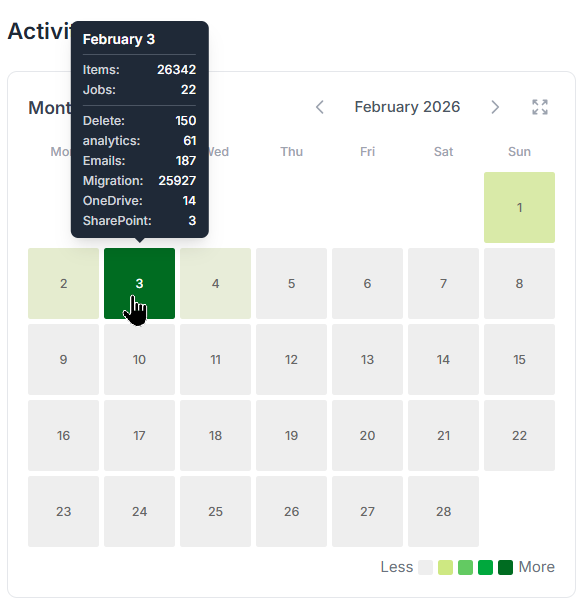 The heatmap is color-coded by activity. You can instantly spot low-activity days and high-traffic spikes. Just hover your mouse over a day to see a tooltip with detailed stats: number of items, job count, and a breakdown by item type.